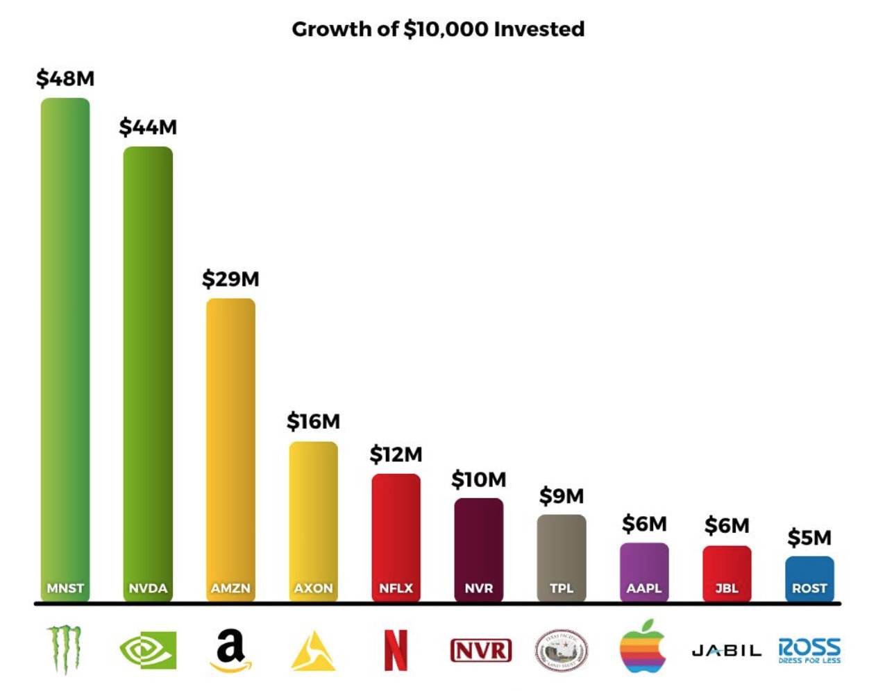 Žebříček nejlepších akcií z indexu S&P 500 za posledních 30 let vede Monster Beverage – investice 10 000 USD by se vám za 30 let zhodnotila na přibližně 48 milionů USD.