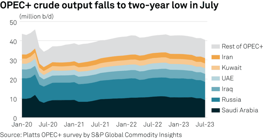 Dohromady 13 členů OPEC produkovalo 27,34 milionů barelů denně, zatímco Rusko a 8 dalších spojenců přidalo 13,06 milionů barelů denně. To je celkově 40,4 milionů barelů denně, což je nejnižší produkce ropy celého kartelu od srpna 2021. Situace se nicméně nelepší, naopak. Nabídka bude zjevně pořád postupně klesat. OPEC+ jednoduše nemá nejmenší důvod, aby svou politiku změnil.