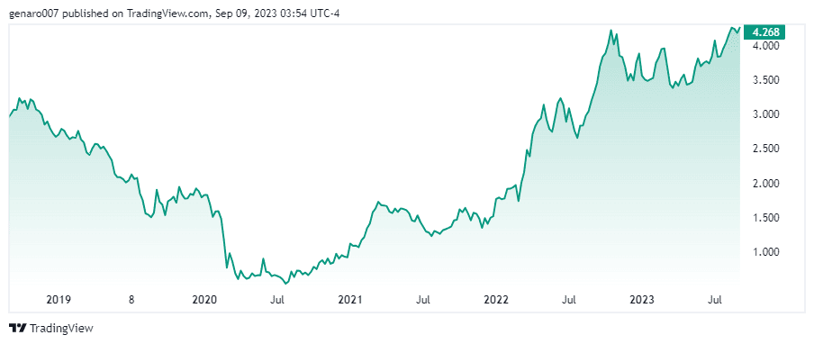 Stejně tak P/E ratio dosahuje 6,98. To je velmi málo. Z pohledu tohoto ukazatele se jedná o velmi podhodnocenou akcií. Pokud doba vysokých úrokových sazeb bude trvat déle než si trhy myslí, akcie společnosti VIG z toho bude silně profitovat.