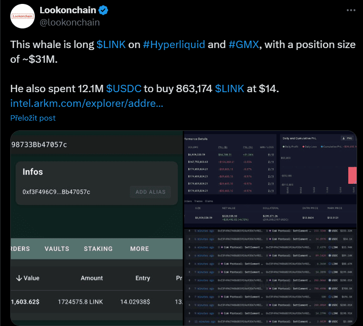 V pátek se díky on-chain datům zjistilo, že ten stejný obchodník začal masivně sázet na kryptoměnu Chainlink. Vybudoval si long pozice v hodnotě přibližně 31 milionů dolarů s využitím desetinásobné finanční páky.
