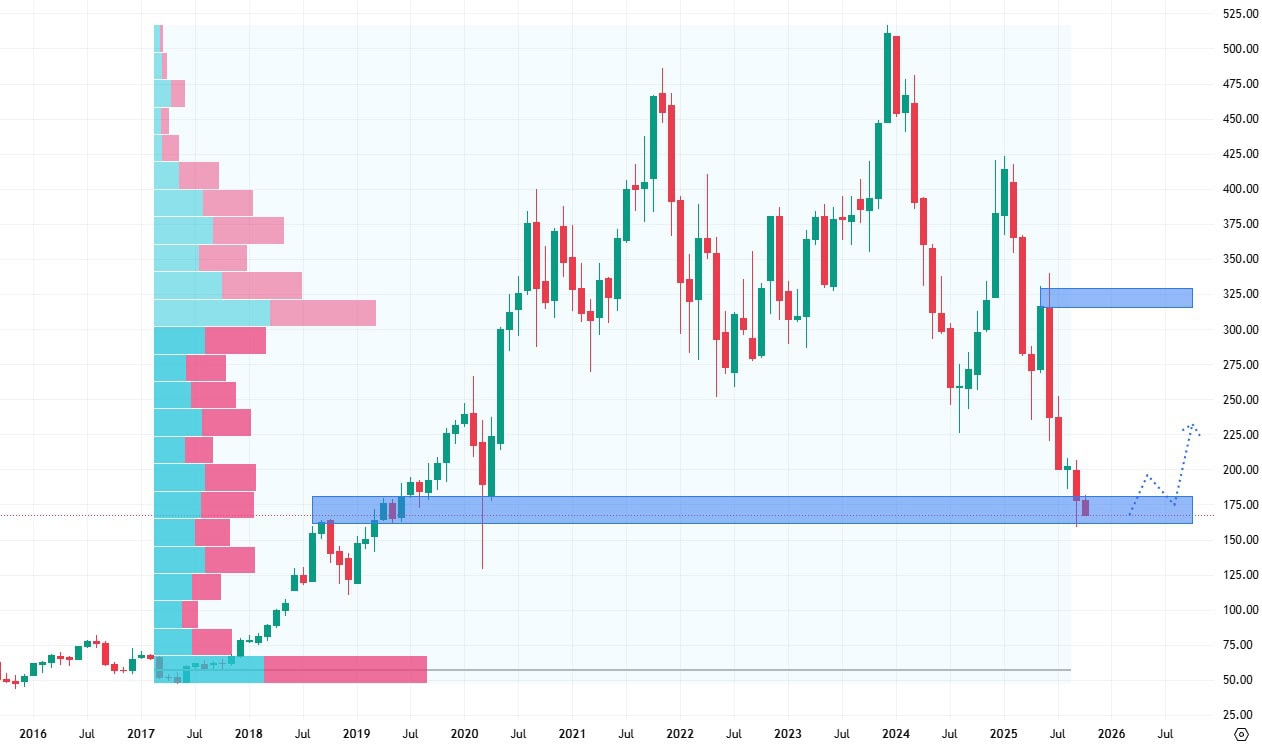 Akcie Lululemon se obchodují na supportu již z roku 2018, ovšem prozatím trh postrádá nákupní reakci. Akcie se dlouhodobě obchodují v down trendu, takže by jim prospěla i konsolidační fáze.