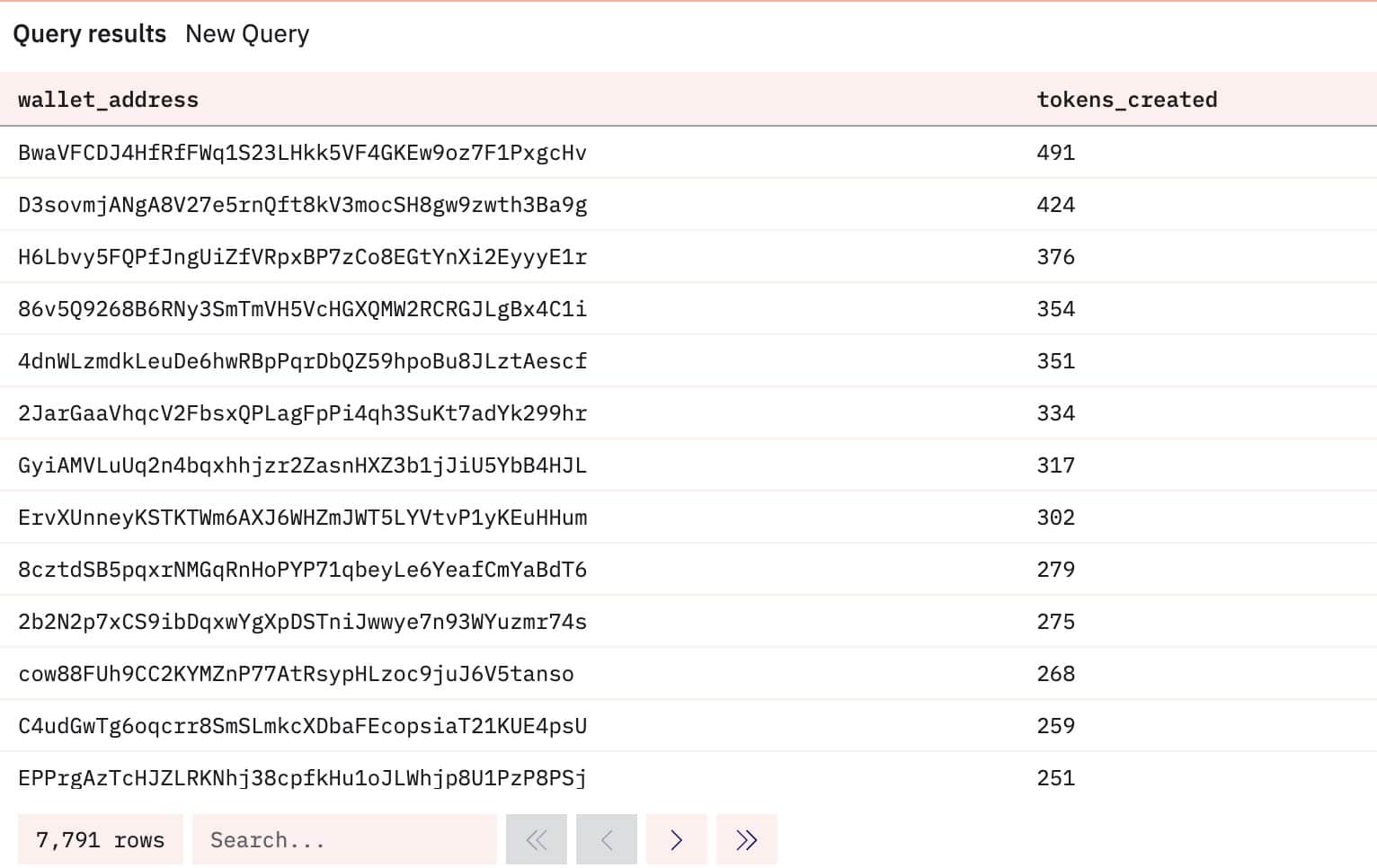 Podle dat Dune Analytics nejaktivnější tvůrce tokenů na platformě spustil celkem 4 669 tokenů. Druhý nejplodnější tvůrce spustil necelých 2 400 tokenů, z toho téměř 500 za jediný den.