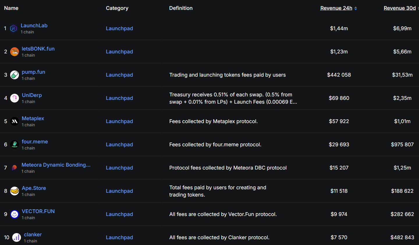 Při srovnání platforem LetsBonk a Pump.fun se zdá, že LetsBonk převzal vedení. Za posledních 24 hodin LetsBonk překonal Pump.fun v tržbách a vytvořených tokenech.