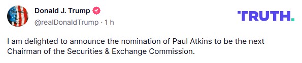 Donald Trump oznámil Atkinsovo jmenování na své síti Truth Social