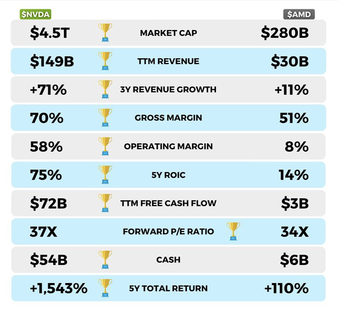 Nvidia je v éře výpočetní AI jasným hegemonem, zatímco AMD teprve dobíhá. Stačí se podívat na pár čísel: tržní kapitalizace 4,5 bilionu vs. 280 miliard USD, tržby 149 miliard USD vs. 30 miliard USD.