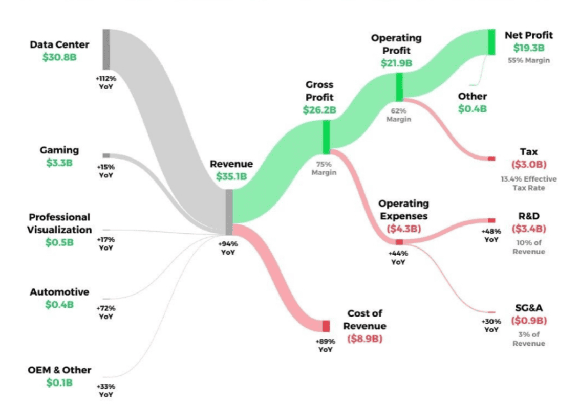 V aktuálním čtvrtletí firma vykázala příjmy z datových center ve výši 30,8 miliardy dolarů, což je více než dvojnásobek oproti minulému roku (112% nárůst).