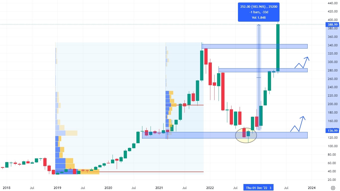 Exponenciální růst akcií Nvidia započal již v prosinci loňského roku, kdy se pád akcií zastavil na hodnotě 120 USD, tedy na hodnotě jedné z nejvýraznějších supportních úrovní se silným volume. Od tohoto okamžiku byl akciový růst bez cenových korekcí a až na jeden slabší měsíc, kdy trh odpočíval na hodnotě 280 USD, hodnota akcií pouze rostla na současné zhodnocení 184 %.