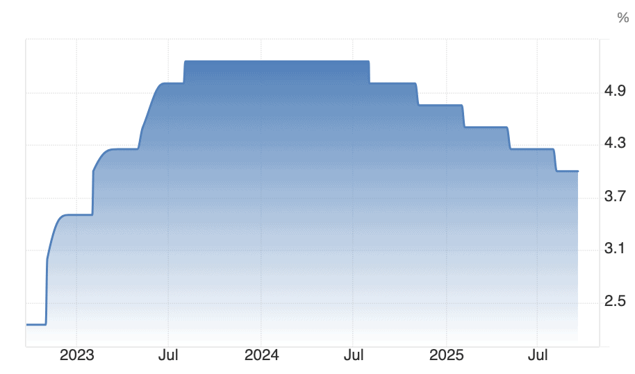 Měnový výbor Bank of England (BoE) hlasoval v poměru 7 ku 2 pro ponechání klíčové úrokové sazby beze změny na 4 %, jak se očekávalo.