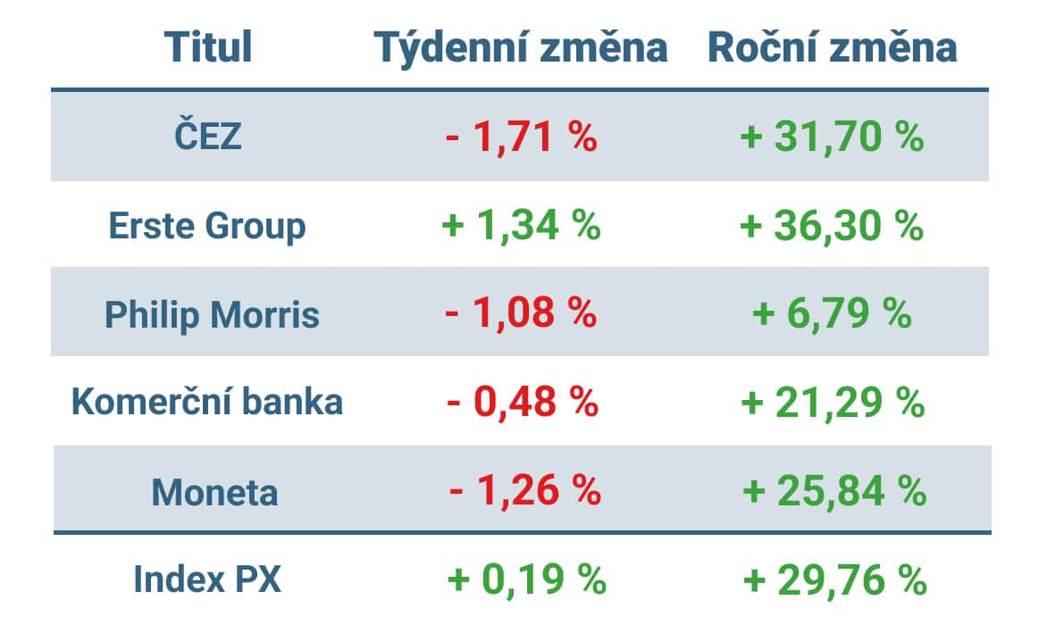 Světlou výjimkou byly v uplynulém týdnu pouze akcie Erste Group, které si připsaly zisk 1,34 %.