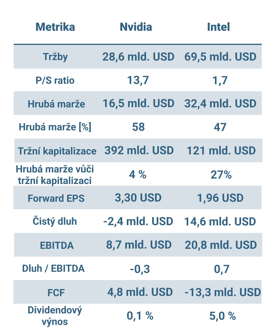 Klíčové metriky akcií Nvidia a Intel