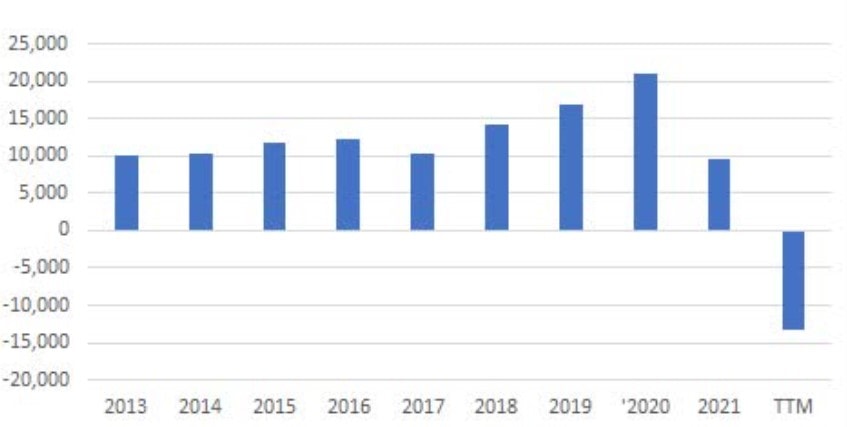 Historicky však Intel generoval obrovské FCF, jak ukazuje následující obrázek. Je pravděpodobné, že se volné peněžní toky Intelu nakonec vrátí na svou vysokou úroveň. Otázkou je kdy?