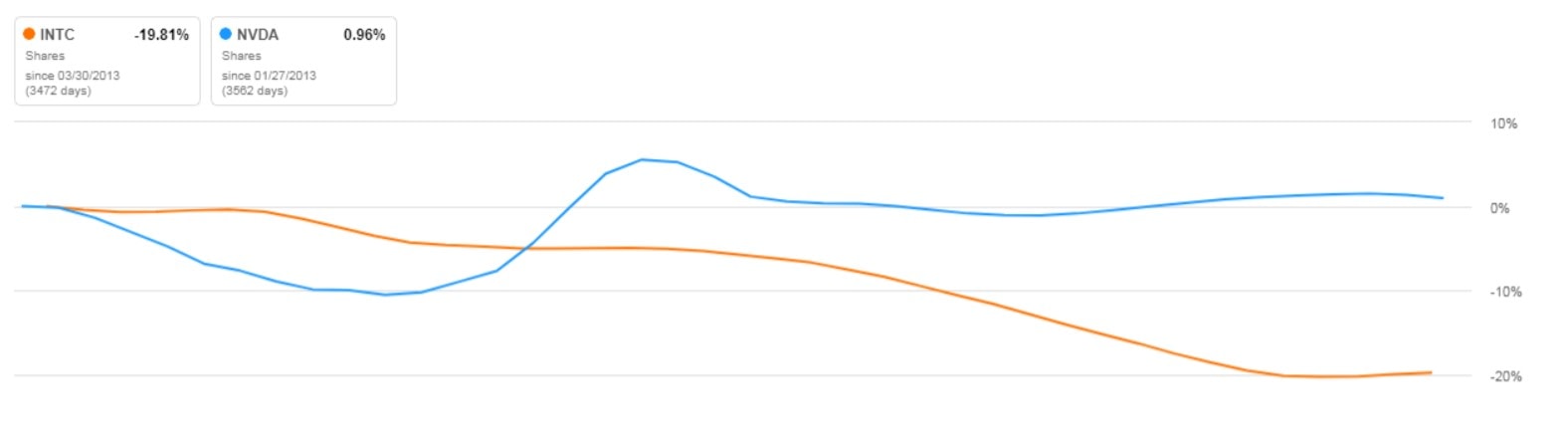 Jednu věc mají akcie obou podniků společnou, a to obrovské ztráty, které utrpěly v roce 2022: Akcie Nvidia klesly o 52,14 % a akcie Intel o 50,82 %.