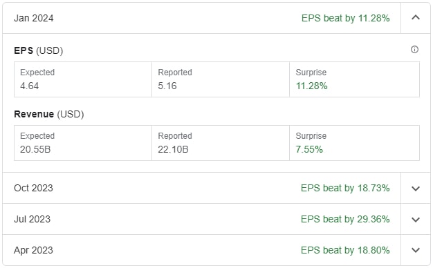 Společnost také uvedla, že v aktuálním čtvrtletí očekává tržby ve výši 24,00 miliardy USD. Analytici přitom aktuálně očekávají zisk 5,00 USD na akcii při tržbách 22,17 miliardy USD.
