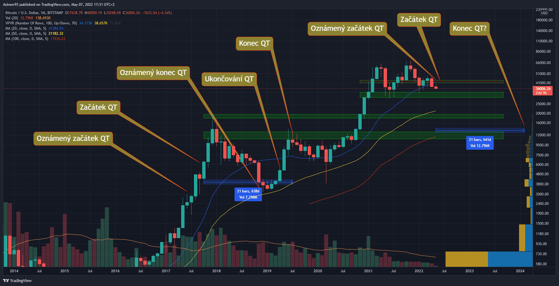 Do grafu s bitcoinem jsem ještě označil pravděpodobné datum pro konec QT. Fed nijak nespecifikoval, jak dlouho redukce rozvahy potrvá. Posledně to však trvalo zhruba 640 dnů – téměř dva roky. A osobně zastávám názor, že ani tentokrát kvantitativní utahování nepoběží déle. Tu možnou cenovou hladinu s koncem QT jsem samozřejmě zaznačil “od oka”. Nevidím do budoucnosti.