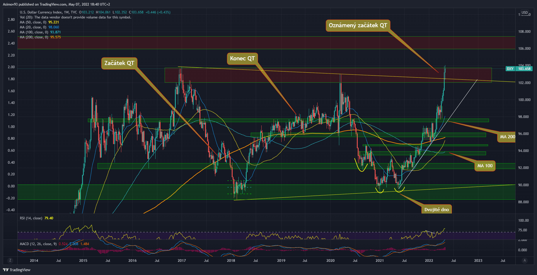 Dolarový index logicky reaguje opačně, protože kvantitativní utahování znamená růst úrokových měr. A růst úrokových měr samozřejmě zvyšuje atraktivnost amerického dolaru. Když investoři z rizikových aktiv odcházejí, musí poptávat likviditu v podobě amerického dolaru. Rostoucí dolar je mimochodem býčí pro federální dluhopisy, protože úrok se vyplácí právě v dolaru. Každopádně z grafu vyplývá, že trh se připravoval na restriktivní měnovou politiku velmi dlouho.