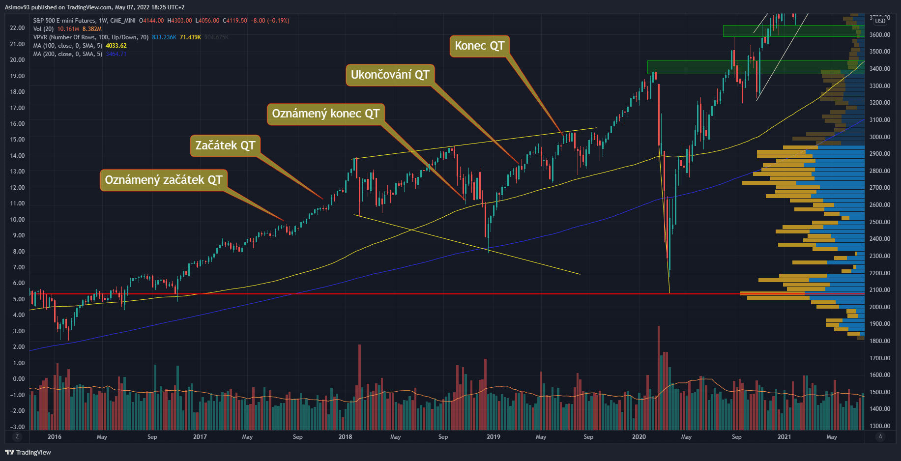 Vtip je v tom, že těsně před tržním minimem z roku 2018, Fed oznámil, že kvantitativní utahování bude v roce 2019 ukončeno.Tehdy Fed završil i cyklus růstu úrokových sazeb. Trhy proto dostaly jasný signál, že agresivní restriktivní měnová politika je u konce – příprava na změnu trendu může začít. Z výše přiloženého grafu můžete sledovat, že v době počátku postupného ukončování QT již začal býčí trend – trh věděl, co se bude dít a proto reagoval s předstihem (očekávání). A ve chvíli, kdy redukce rozvahy oficiálně skončila (červenec 2019), šel trh do dlouhé korekce, která vyústila v ten velký “covidový” crash.