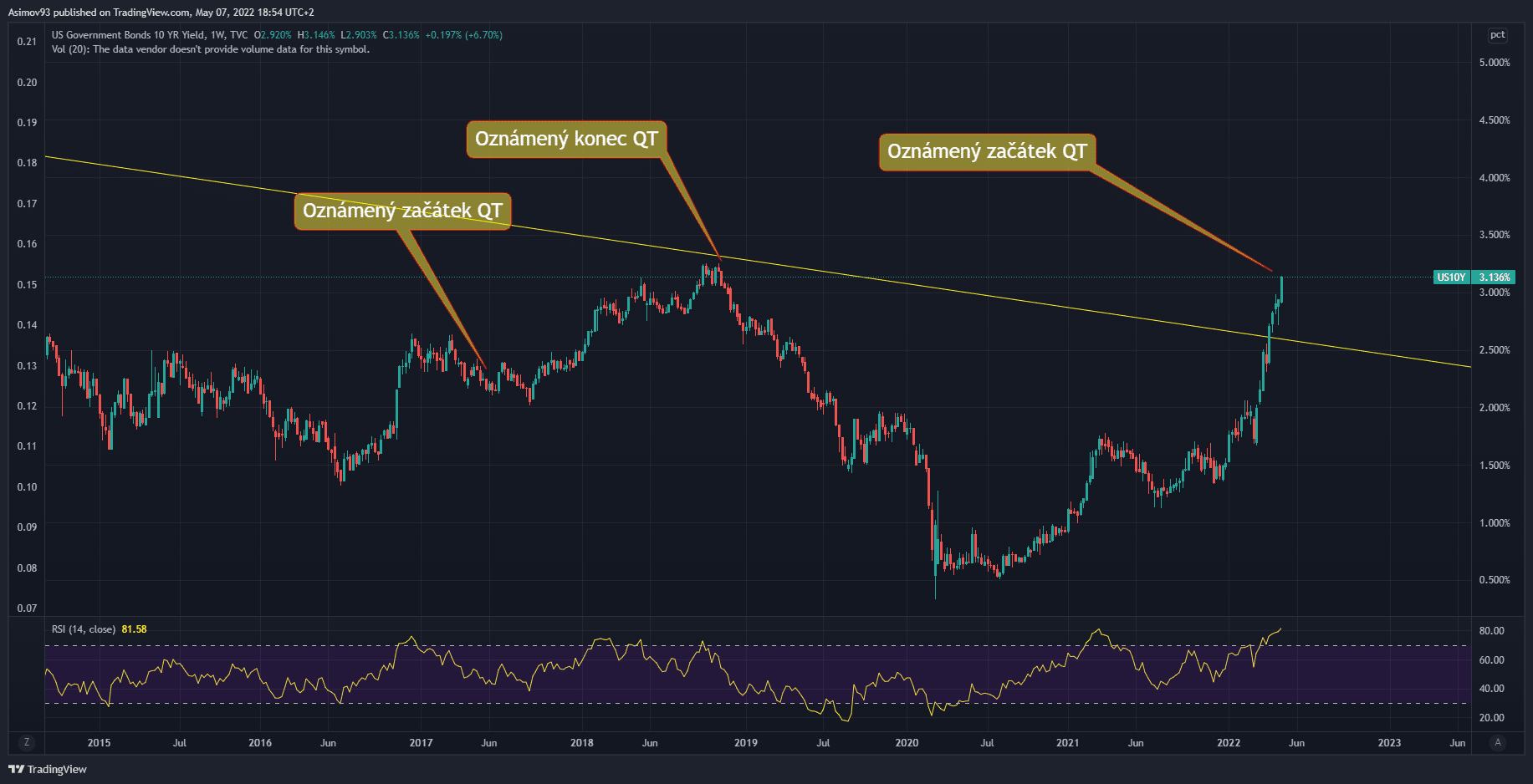 Zase podobná situace jako na bitcoinu. Trhy věděli, že kvantitativní utahování přijde od druhé poloviny minulého roku. Sice redukce rozvahy nebyla oficiálně ještě oznámená, ale přesto se už do trhu započítávala.