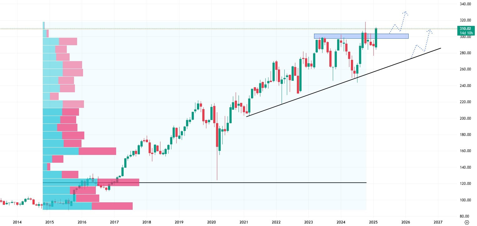 Akcie společnosti i přes to rostou a obchodují se kousek od svých maxim. Dlouhodobý up trend by mohl být narušen v případě, že i v Q1 2025 společnost nevykáže růst.