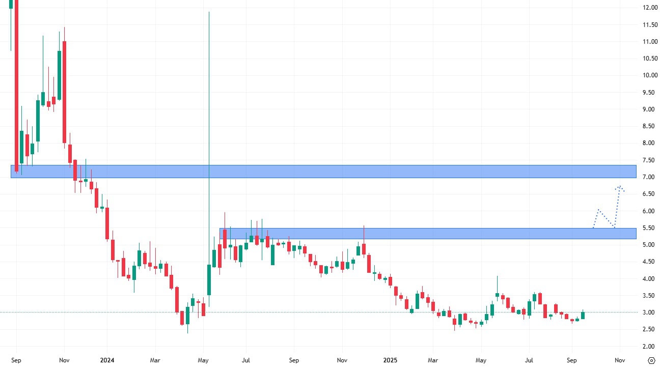 Nejbližší rezistence se v současné době nachází na hodnotě cenových maxim okolo 5,50 USD za akcii s tím, že po průrazu by akcie příliš velký potenciál růstu neměly, kvůli proraženému cenovému dnu na hodnotě 7 USD za akcii.