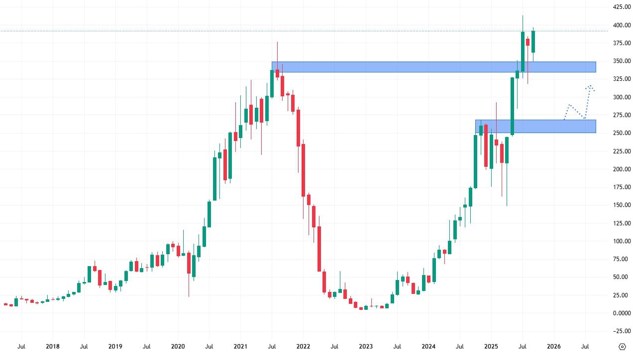 Trh tento support již otestoval a to spěšně, nicméně při dalším retestu již může být jeho validita snížena. Pokud by došlo k oslabení akcií pod hodnotu tohoto supportu, ten další se nachází až na ceně 250 USD za akcii.