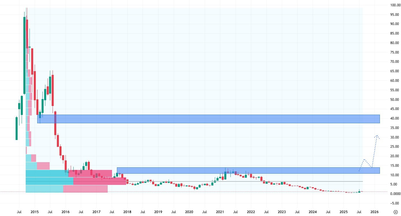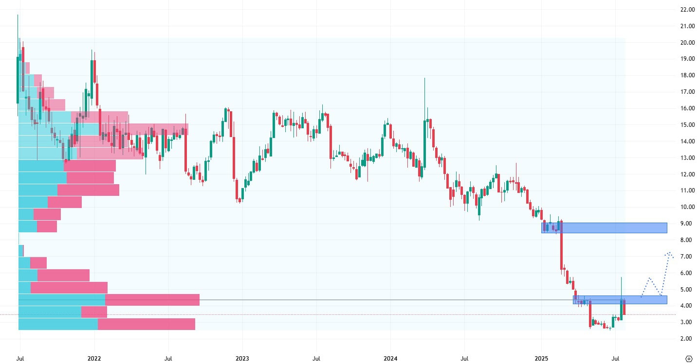 Pro cenový růst bude nezbytný průraz nejbližší rezistence na 4,50 USD. Poté akcie mohou agresivně růst, protože by se dostaly do oblasti prodejního gapu, kde nejbližší rezistenci bude tvořit až jeho horní hrana na ceně 9 USD za akcii.