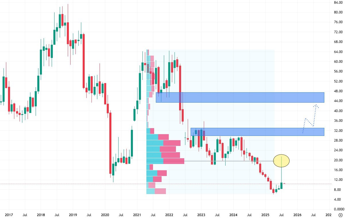 Zamítnutí vyšších cenových úrovní nedovolilo největší volume a také rezistence, které spolu tvoří konfluenci. Aby se zde dalo hovořit o růstovém potenciálu, bude nezbytné, aby se akcie obchodovaly v oblasti konsolidace nad 20 USD.
