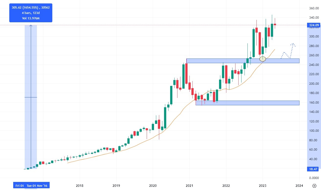 Měsíční akciový graf společnosti ServiceNow