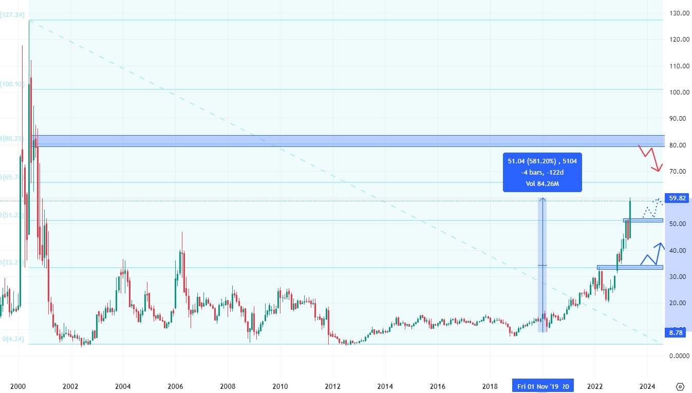Tato mezinárodní společnost dodává polovodičové produkty do celého světa. Od roku 2020, kdy enormně vyskočila poptávka po polovodičových čipech, raketově vystřelila cena akcií této společnosti. Akcie Rambus od té doby vzrostly o 581 % a nezadržitelně se řítí k nejbližší rezistenci na ceně 80 USD, kde se nachází i konfluence v podobě Fibonacciho Retracementu.