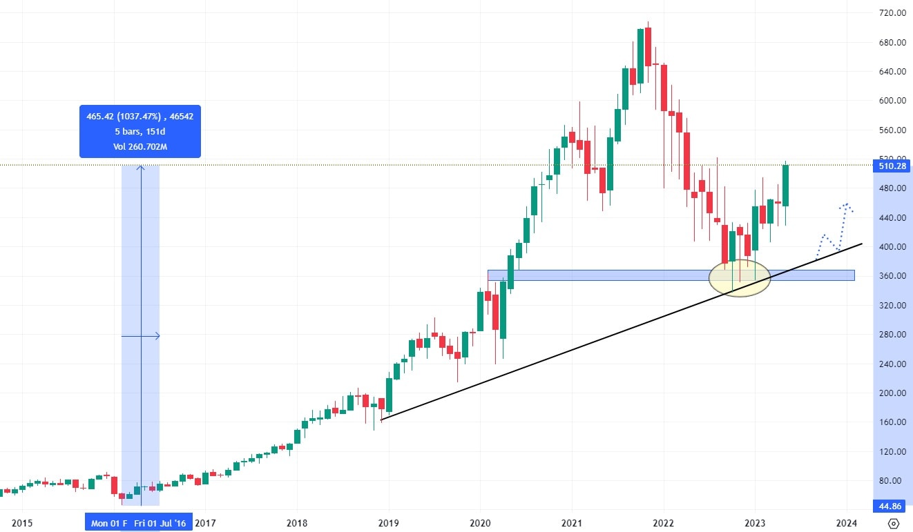 Na ceně 360 USD akcie ServiceNow učebnicově reagovaly na konfluenci trendové čáry a supportu, což jim pomohlo k cenovému růstu. Díky absenci výrazných rezistentních zón může cena akcií této společnosti bez větších problémů opět atakovat svá historická maxima.