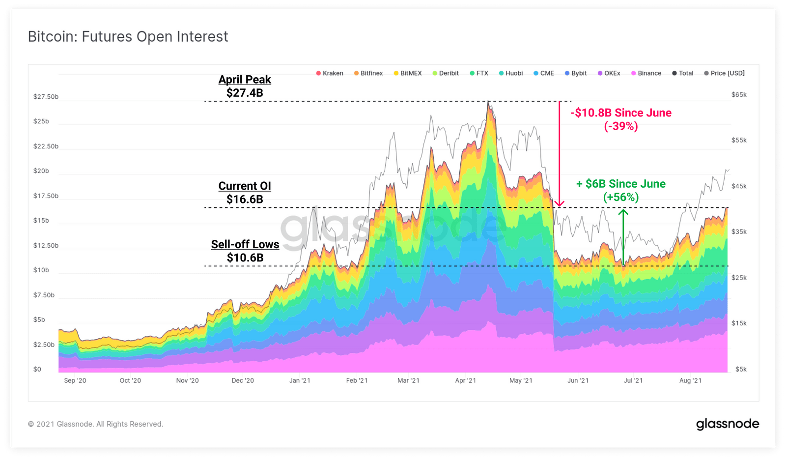 Od květnového propadu se objem obchodovaných futures zvýšil o dalších 6 miliard dolarů. Jen za poslední týden se množství otevřených futures pozic zvýšilo o 1 mld. dolarů.