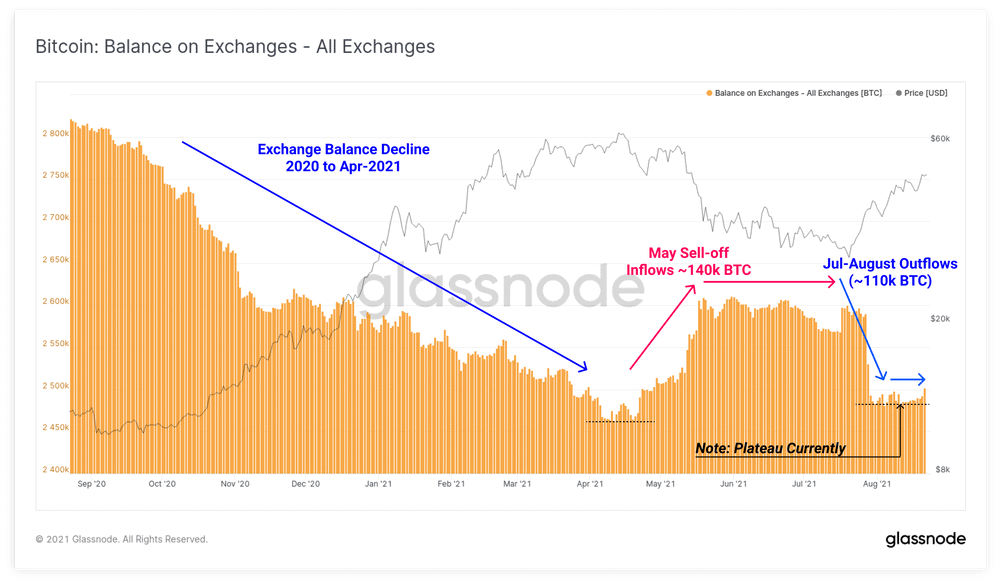 Při květnovém propadu bylo možné zaznamenat rostoucí množství coinů na burzách, přičemž v posledních týdnech tato metrika znovu silně poklesla.