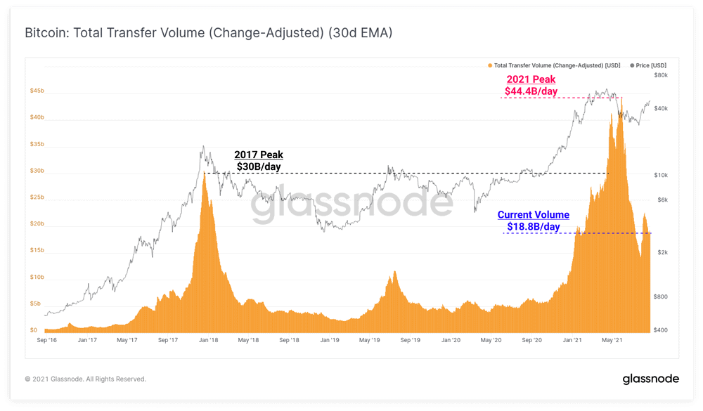 Z pohledu objemu transakcí proběhnou během dne obchody za 18,8 mld. dolarů. To je o 37 % méně než na vrcholu bubliny v roce 2017 – o 57,6 % pod vrcholem stanoveným během květnového výprodeje. Na druhou stranu, běžný zobchodovaný objem zůstává o 276 % výše, než byl průměr pro rok 2020.