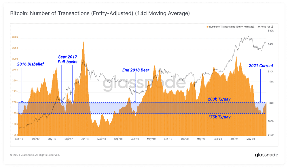Počet transakcí je na minimech – pohybuje se mezi 175 000 až 200 000 za den. Během posledních pěti let jsme mohli podobnou situaci zaznamenat již několikrát. Dle grafu můžeme vidět, že stejných hodnot jsme dosáhli naposledy na konci roku 2018, tedy v nejhorších chvílích medvědího trhu.