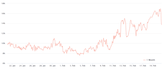 Prémie BTC kontraktů kolem 20. února se pohybovala na 17 % a BTC dosáhl 53 tisíc USD. Při poklesu na 50,7 tisíc USD klesla na 14 %, což naznačuje, že pokles netlumil býčí náladu.