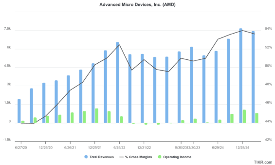 Ve svém posledním kvartálu, končícím 29. března, AMD oznámila tržby ve výši 7,4 miliardy USD, což představuje meziroční nárůst o 36 %. Dobrý je i vývoj hrubé marže, která dosahuje 53 %.