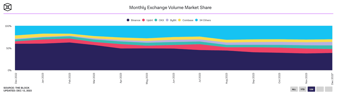 Kryptoměnová burza Binance zaznamenala v průběhu roku znatelný pokles svého tržního podílu, částečně kvůli právním problémům. Na začátku roku jí patřil dominantní více než 55% podíl, který od té doby podle údajů společnosti TheBlock klesl na méně než 40 % v prosinci.