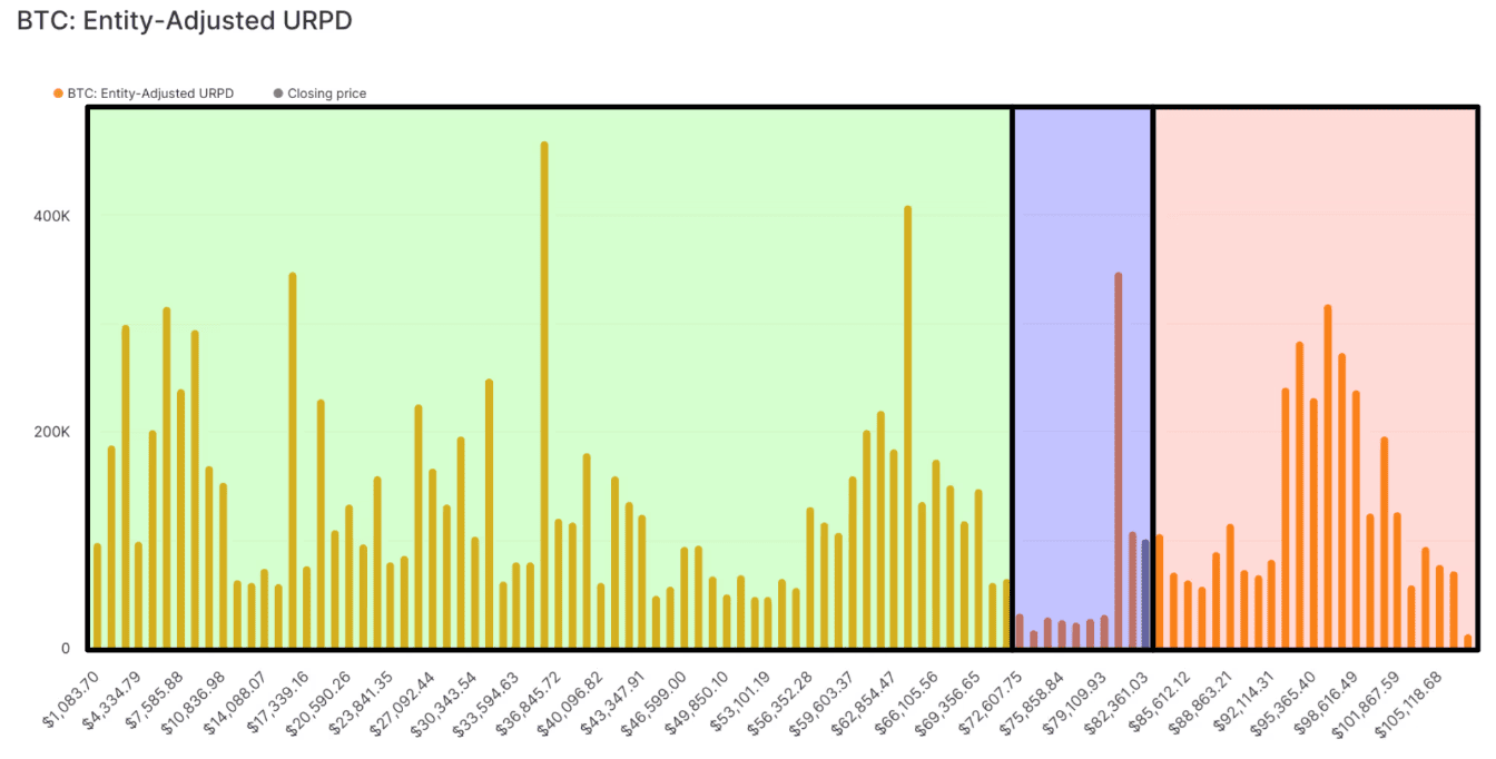 Rychlý růst Bitcoinu z 60 000 na více než 100 000 dolarů po vítězství Donalda Trumpa v amerických volbách zapříčinil, že pouze malé množství bitcoinů bylo nakoupeno v pásmu 70 000 až 80 000 dolarů.