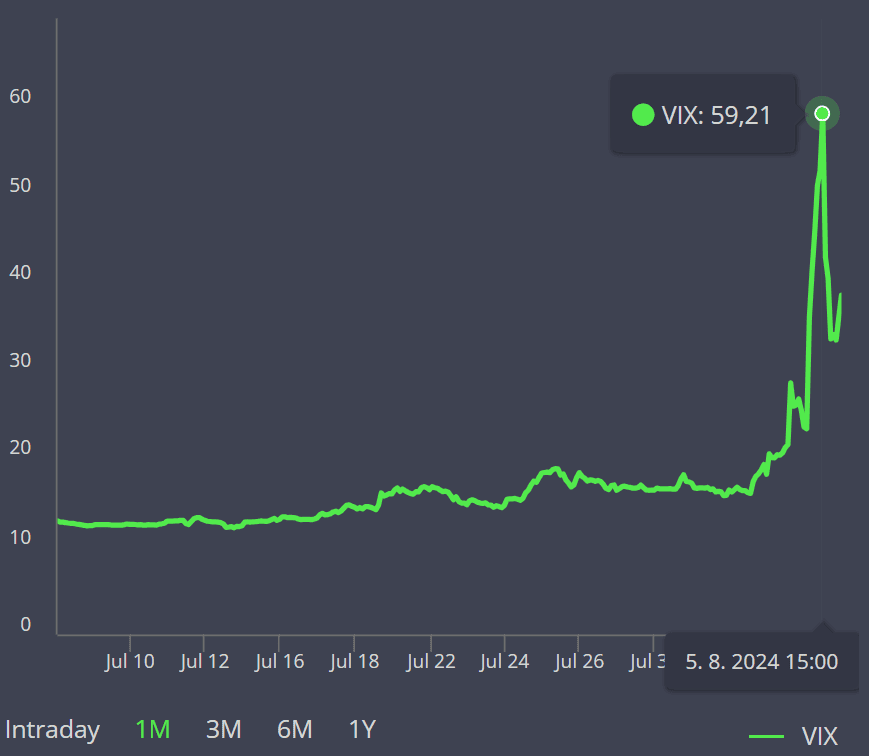 Prudký nárůst japonského jenu vůči americkému dolaru (USD/JPY) podnítil masivní výprodej, protože spekulanti, kteří si půjčili peníze při téměř nulové úrokové sazbě v Japonsku na nákup amerických rizikových aktiv, likvidovali své pozice.