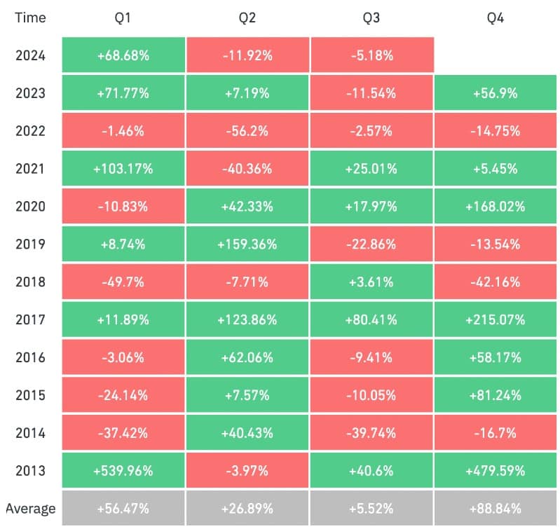 Poslední čtvrtletí roku je ale historicky pro Bitcoin tím nejlepším (naopak Q3, ve kterém jsme nyní, nejhorším), jak je vidět z tabulky níže.