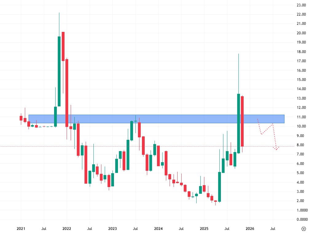 Akcie Navitas Semiconductor jsou poměrně volatilní a to především v posledních dvou měsících. Po agresivním cenovém růstu následoval stejně agresivní cenový pokles, který akcie poslal dokonce pod hodnotu důležitého supportu.
