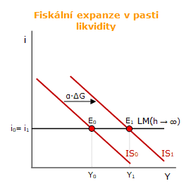 Naopak fiskální expanze je v pasti likvidity maximálně efektivní, protože nedochází k růstu úrokové míry (i) při rostoucím produktu (Y), díky čemuž je efekt vytěsnění na soukromé investice a spotřebu nulový.