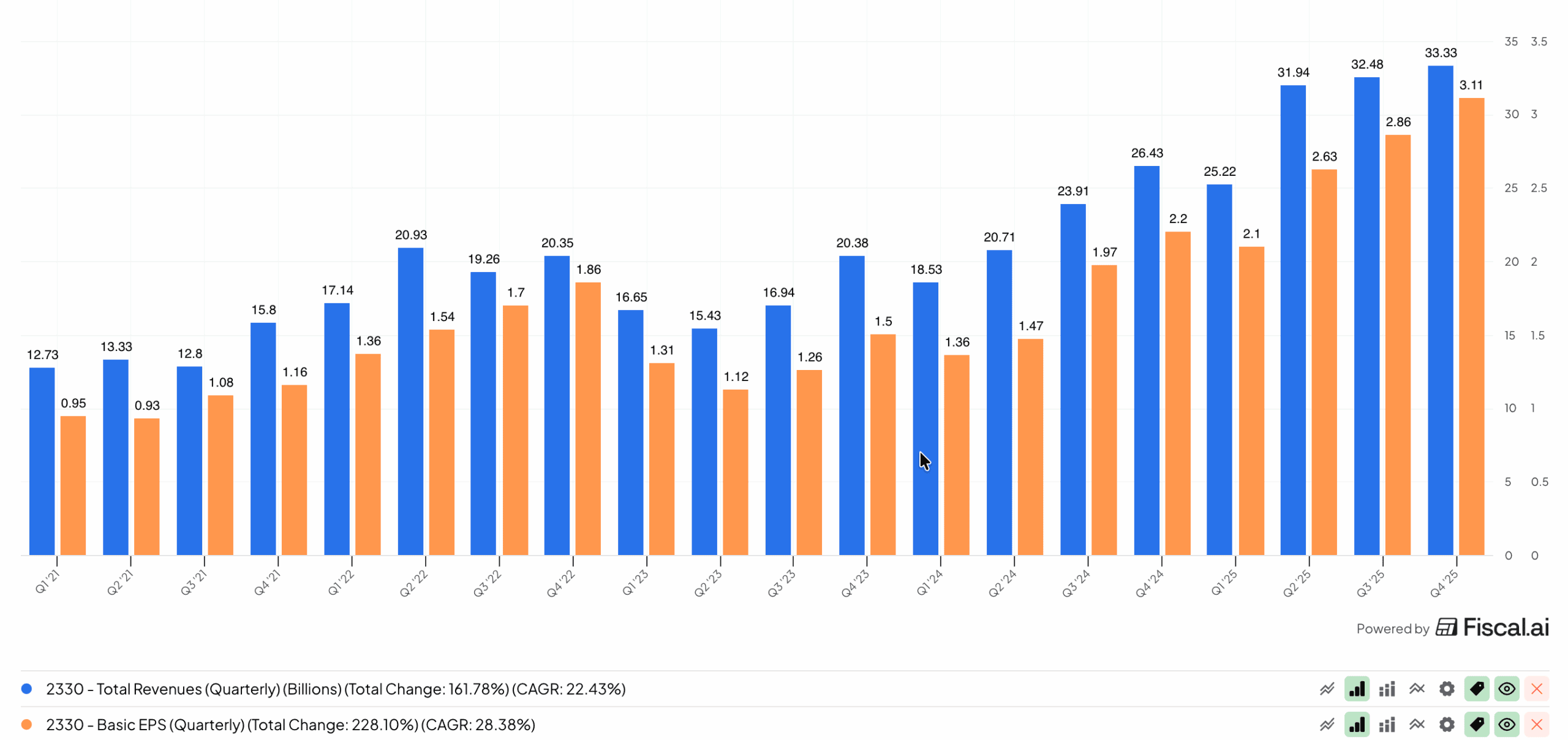 Vykázané tržby překročily hranici 1 bilionu tchajwanských dolarů, což odpovídá přibližně 33 miliardám USD. Meziročně vzrostly o více než 25 %.