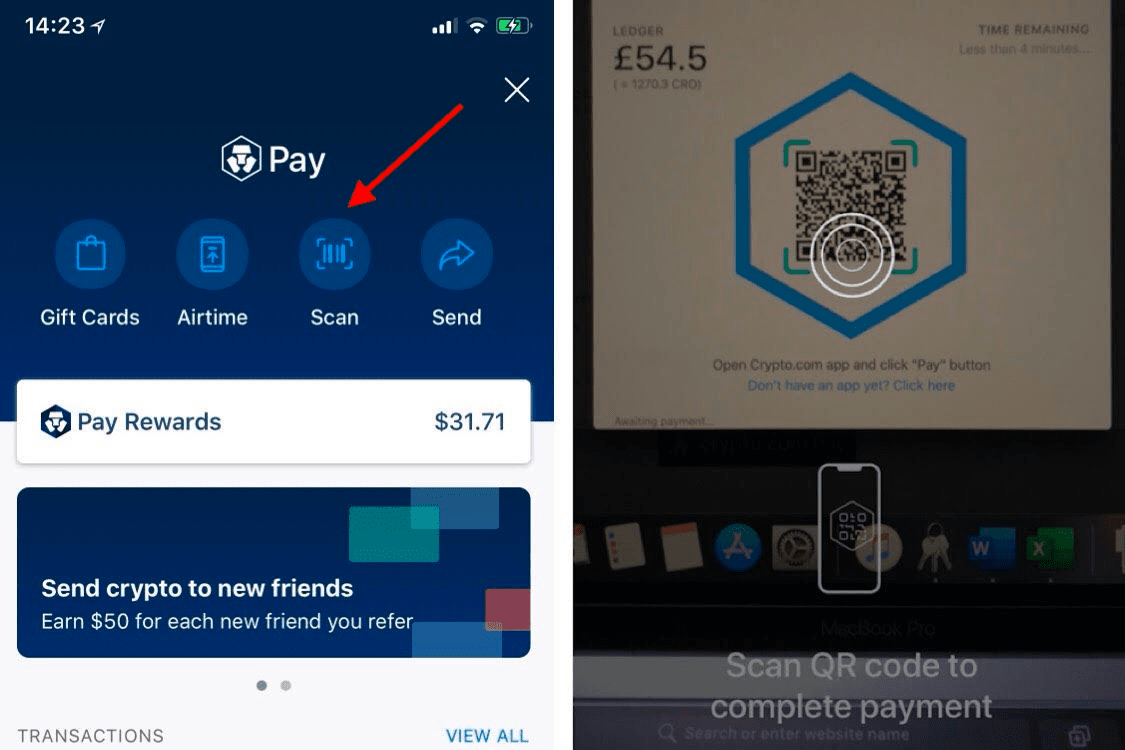 Způsob placení probíhá opět pomocí QR kódu. Obchodník vám vygeneruje QR kód, který pomocí aplikace Crypto.com App načtete. Za tímto účelem v aplikaci nejprve budete muset otevřít sekci pro placení, buď na titulní stránce či skrze menu možností. Pak klikněte na Scan, aplikace vás následně přemístí do rozhraní fotoaparátu a požádá vás o naskenování QR kódu.