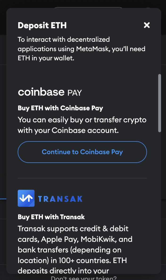 S Coinbase Pay vše probíhá čistě automaticky! Peněženka se s burzou spojí a jakmile se s danou peněženkou pak připojíte na jakoukoliv dAppku, např. burzu Uniswap, můžete pro obchodování využít zůstatek přímo na Coinbase účtu, jenž jste s peněženkou spárovali. Např. v peněžence MetaMask můžete peněženku propojit s Coinbase Pay po otevření dialogu pro nákup kryptoměn.