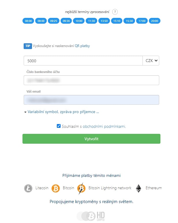 Jedná se svým způsobem o kryptoměnovou směnárnu, na níž můžete vaše kryptoměny směnit za koruny, které služba obratem zašle příjemci na bankovní účet. Na titulní stránce stačí pouze zvolit variantu Zaplať kryptem, budete následně přemístěni do následujícího formuláře.