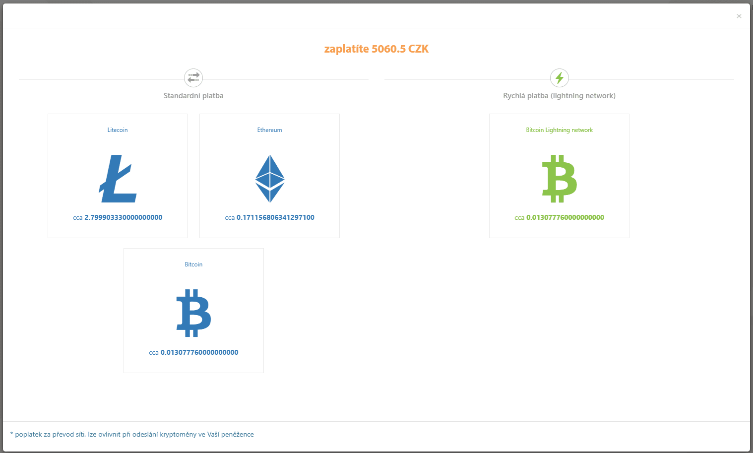 Zde vyplňte částku v korunách, zadejte číslo cílového bankovního účtu a vyplňte další položky jako například variabilní symbol. Po vyplnění údajů a odsouhlasení obchodních podmínek si projděte rekapitulaci transakce a pakliže vše sedí, v dalším dialogu klikněte na Zaplatit. Nyní budete mít na výběr z následujících variant – můžete zaplatit Bitcoinem, Ethereem, Litecoinem nebo Bitcoinem přes Lightning Network.