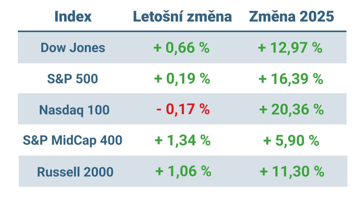 Tabulka ukazuje vývoj nejvýznamnějších amerických indexů od začátku roku a v roce 2025