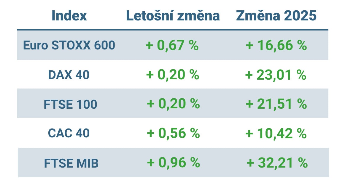Tabulka ukazuje vývoj nejvýznamnějších evropských indexů od začátku roku a v roce 2025