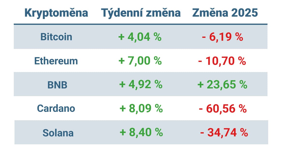 Vývoj ceny nejvýznamnějších kryptoměn za posledních 7 dní a v roce 2025