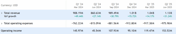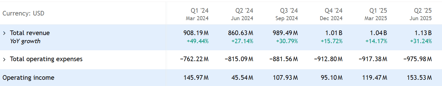 Růst společnosti potvrzují tržby, které v Q2 2025 stouply o 32 % a dosáhly 1,13 miliardy USD.